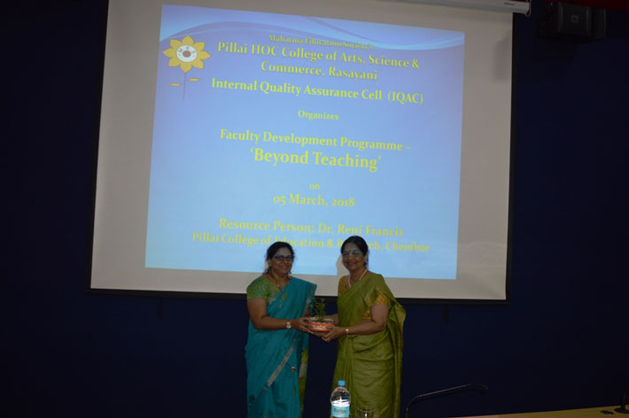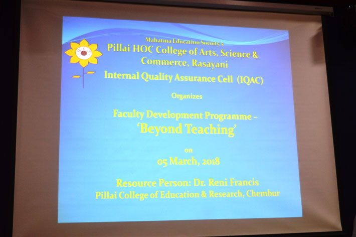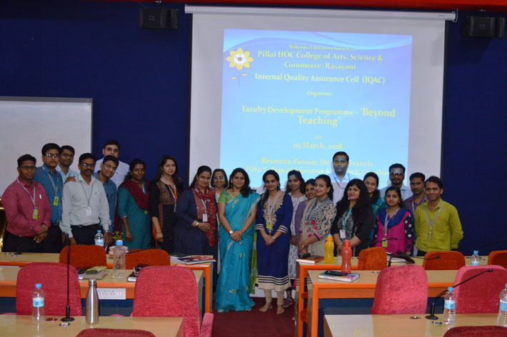 The IQAC team of Pillai HOC College of Arts, Science and Commerce organized a Faculty Development Workshop entitled “Beyond Teaching” on 5th March, 2018. The workshop was part of the Teachers Training initiative of the institution. The resource expert was Dr. Reni Francis from Pillai College of Education and Research, Chembur, who was recently awarded with Honorary D-Lit by the University of South America. The aim of the workshop was to reinforce to the staff members, the importance of aligning all their activities towards achieving the Mission and Vision of our Institution. All faculty members from the departments of Arts, Science and Commerce, participated enthusiastically and had an interactive session with the expert speaker on how to enrich their routine duties beyond classroom teaching.