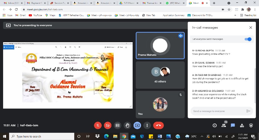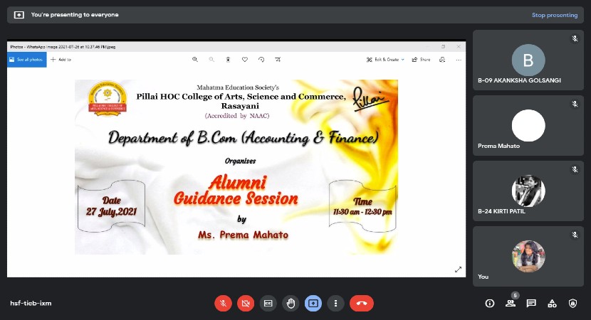 The Department of B.Com. (Accounting and Finance) organised an ‘Alumni Guidance Session’ on Tuesday, 27th July, 2021 for the benefit of the Third Year students as an eye-opener for them as to which stream they can choose and to have clarity on the scope of each and every stream of specialisation offered for the Accounting & Finance students.