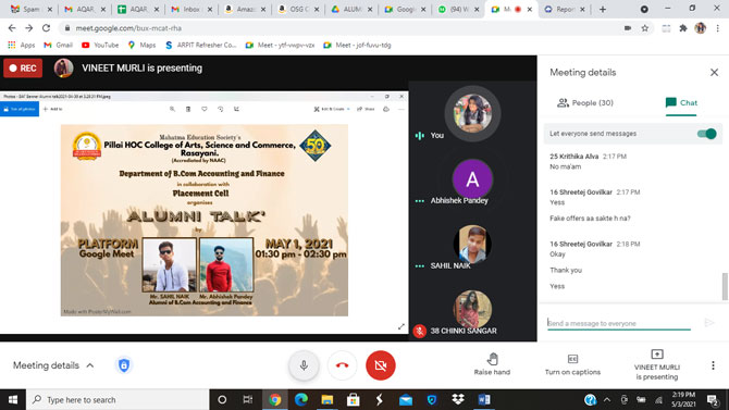 The Department of B.Com. (Accounting and Finance) in association with Placement Cell had organised an ‘Alumni Talk’ on Monday, 3rd May 2021 for the benefit of the Third Year students as an eye opener for them as to which stream they can choose and to have clarity on the scope of each and every stream of specialization offered for the Accounting & Finance students.