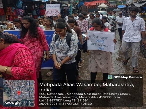 The program began with a briefing for volunteers by the supervising professors before the rally was flagged off. The rally, which travelled from the college to Mhopada market and surrounding areas, targeted locations with a high public presence. To raise awareness, volunteers carried banners and posters with impactful slogans and messages against plastic use.