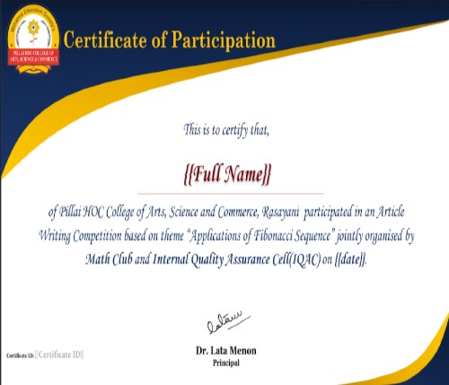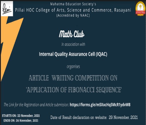 Math Club in association with IQAC, successfully organised Article Writing Competition on “Applications of Fibonacci Sequence” on 23rd to 26th November, 2021. Total 05 participants are participated in this Competition. E-certificates have been issued to all those who are participated. The objective of this event is to observe Fibonacci Day as when the date is written in the mm/dd format (11/23), the digits in the date form a Fibonacci sequence as 1,1,2,3.
