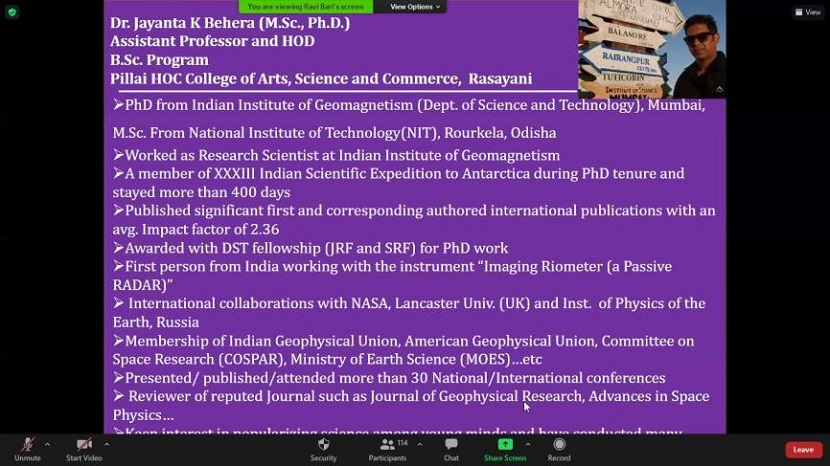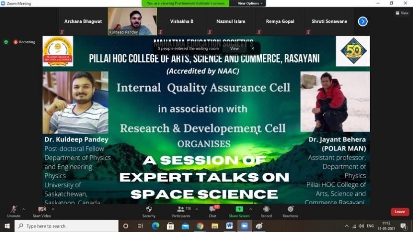 Research and Development Cell in association with Internal Quality Assurance Cell (IQAC) has successfully organised a session of expert talks on space science on 31st May, 2021. Dr. Kuldeep Pandey, Post-Doctoral fellow at Department of Physics and Engineering Physics, University of Saskatchewan, Canada and in house speaker Dr. Jayanta Kumar Behera from department of Physics, Pillai HOC College of Arts, Science and Commerce, were the respected resource persons for this event. Our resource persons elucidated the delegates about space science.