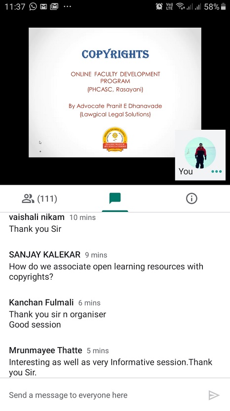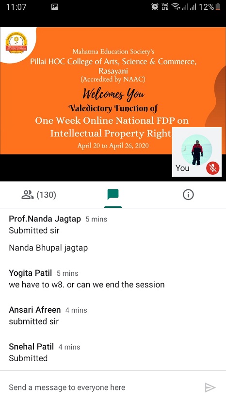 The last day commenced with welcoming the resource person and the delegates. Our College shared the history of our parent organization Mahatma Education Society and the patrons. Our Principal addressed the delegates welcomed them and wished them a very happy World Intellectual Property Day, the culmination of our National Level FDP on Intellectual Property Rights. She also thanked them for their encouragement and support. Our resource person for our FDP, Adv. Pranit Dhanawade also addressed the delegates. After the same, an online test of 50 marks for the duration of 50 minutes was organized. The instructions were provided by our event Convener, Dr. Jayant Behera. The mode of conduction was online google forms, the link for the same was shared in the group and google meet chat box. After the submission for the same by the delegates, the organizing team took feedbacks from a few of them. All the delegates were provided with e-certificates for the FDP, provided their attendance records were good, they appeared foe exam and submitted the feedback forms. A total of 270 delegates appeared for the online exam and received e-certificate for the same. The event concluded with a vote of thanks proposed to resource person, management, delegates and entire team of faculty members of the college.