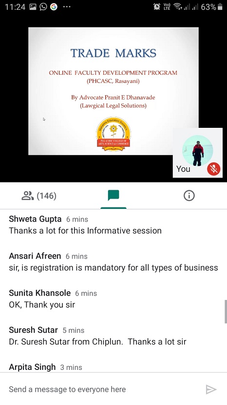 Day four of the event was centered on the most popular and significant topic under IPR, Patents. The session started with a usual welcome note to our resource person Adv. Pranit Dhanawade and delegates. The presentation began with basic information on the topic such as cocept, terms used and Patent Act, 1970. The focus of the session was on criteria of patentability and non inventions as per Patent Act. The speaker listed out non inventions in the field of health, Environment, Science, Technology, Agriculture, Medicine, Industry, Algorithms, Biological process, Arts and the likes. The speaker also discussed Patent Cooperation Treaty and explained the patent filing procedure nationally and internationally. Provisional and complete specification and their merits and demerits were also enumerated. Term period for patents, restoration of lapsed patents and surrender of patents, which are of great application potential were also presented. The speaker also provided information about authorities by Central Government in the likes of Controller General of Patents and territorial jurisdiction of patent offices. The information on database of Indian patents was also provided as a final statement of conclusion. 264 delegates attended the presentation which was followed by Q & A session. The clarification was given by our resource person to the delegates on the basis of questions shared through microphone or chatbox. The session concluded with a vote of thanks to meet again for next session. The session received positive feedbacks from delegates.