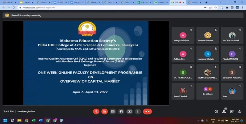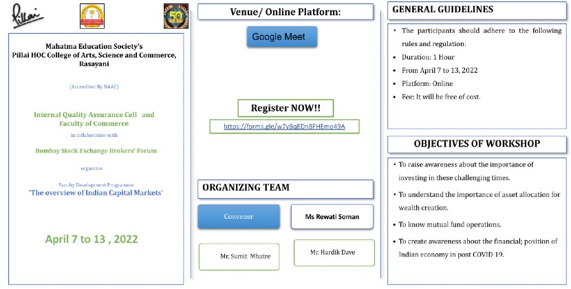 IQAC of Pillai HOC College of Arts, Science & Commerce (PHCASC) & Faculty of Commerce in collaboration with Bombay Stock Exchange Brokers’ Forum successfully organized Faculty Development Programme on ‘The overview of Indian Capital Markets’.