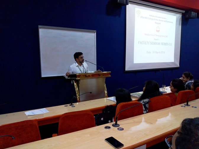 IQAC, in collaboration with Research and development cell of our Institute, initiated Faculty seminar series session wise. The first session was organized on 24th March, 2018. In the first session, selected Faculty members presented their research work, wherein, broad band of research areas were clearly evident. The research areas of faculty members were ranging from Space science to Nanotechnology, Big data Hadoop to Laws for surrogate mother and Gap year, a poem by Jackie-Kay to Magic realism.