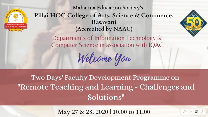 Departments of Information Technology and Computer Science in association with Internal Quality Assurance Cell (IQAC) of Mahatma Education Society’s Pillai HOC College of Arts, Science and Commerce (PHCASC) organized a Two Days FDP on “Remote Teaching and Learning – Challenges and Solutions” on 29th and 30th May, 2020 for teaching staff of all disciplines. This programme oriented to provide the knowledge on various online tools that can be used to conduct online lectures for students. The resource persons for the event were Ms. Rajeshri Aneesh, Asst. Professor, Pillai HOC College of Engineering and Technology, Rasayani and Ms. Babitha Bhagat, Asst. Professor, Pillai HOC College of Engineering and Technology, Rasayani.