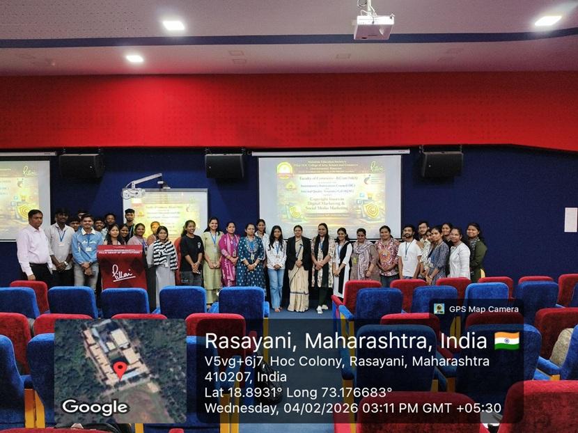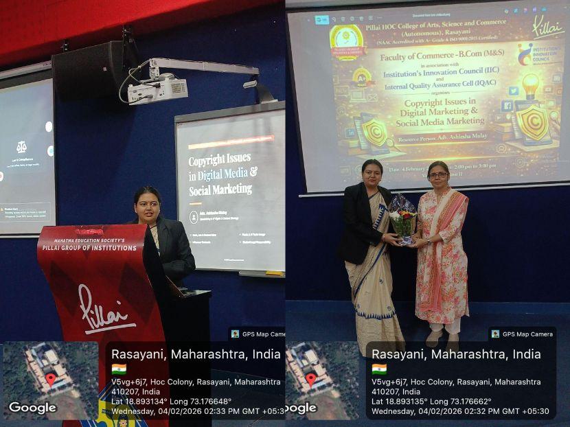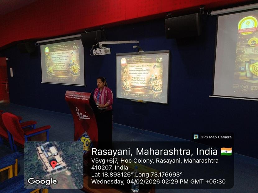 The Program of B.com MS in collaboration with IQAC and IIC of Pillai HOC College of Arts Science and Commerce (Autonomous),Rasayani. conducted an IPR (Intellectual Property rights) Session on the topic “Copyrights Issues in Digital Media and Social Media Marketing ” on 04th February 2026. The session was conducted by Adv.Ashlesha Muley who is an LLM holder and an advisor gave more detailed information how copyrights are infringed and how we can save ourselves from being trapped into any case. The session also provided valuable information regarding some real time examples and also from where we can avail few free sources to download and enjoy the content. The event aimed to enhance skills and knowledge among participants, and it was well-received by all attendees.