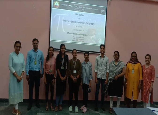 The Math Club in association with Internal Quality Assurance Cell(IQAC) of Pillai HOC College of Arts, Science and Commerce, Rasayani, successfully organized a Competition titled “Memorisation of Digits of Pi” for students of PHCASC on March 14, 2022 at AV Room, 8th floor of PHCASC building. A total of 18 students participate in the event. This competition intends to encourage students to observe “The international day of Mathematics and Pi day”. The attraction of this competition makes Pi such a challenge to memorise and such a draw to people who want to demonstrate their memory.