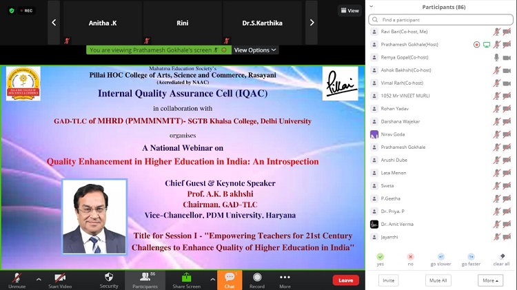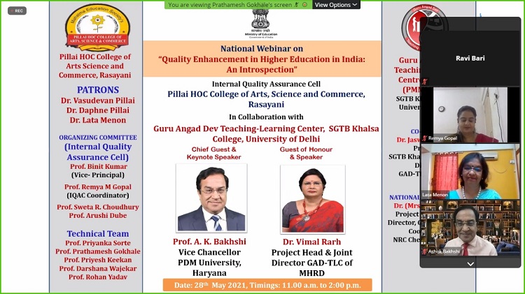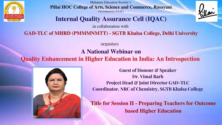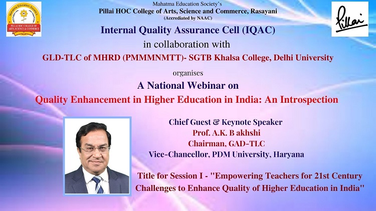 Internal Quality Assurance Cell (IQAC) of Mahatma Education Society’s Pillai HOC College of Arts, Science and Commerce (PHCASC), Rasayani, in collaboration with GURU ANGAD DEV TEACHING-LEARNING CENTRE OF MHRD (PMMMNMTT)- SGTB Khalsa College, Delhi University organised a National Webinar titled Quality Enhancement in Higher Education in India: An Introspection on 28 May 2021, as a part of the process of striving excellence in education.