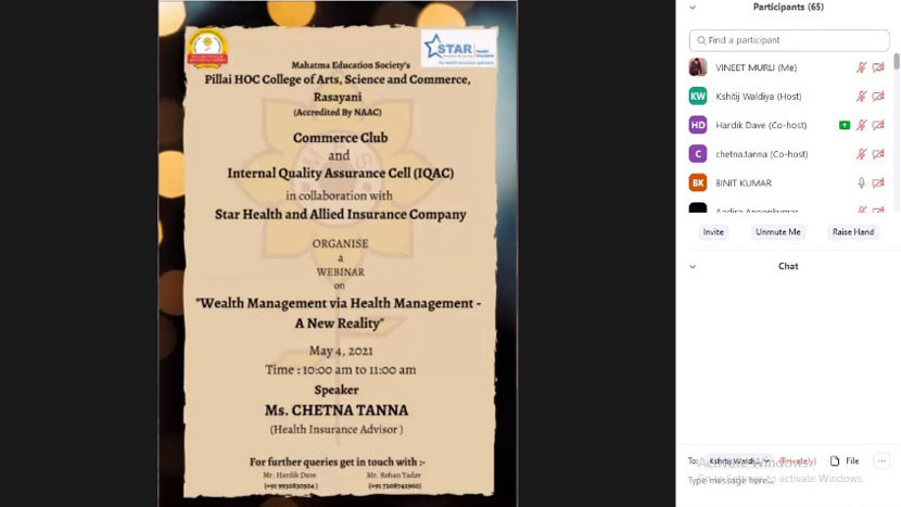 The Commerce Club and Internal Quality Assurance Cell (IQAC) successfully conducted on 4th May, 2021 an Online Webinar on “Wealth Management via Health Management – A New Reality” The invited Resource Person for the webinar was Ms. Chetna Tanna, MCS, M.B.A. in Systems.
