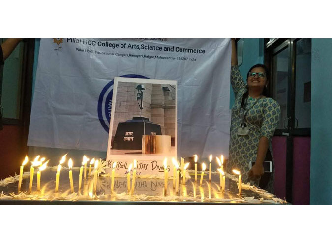 The NSS Unit of Pillai Hoc College of Arts, Science and Commerce College, celebrated Kargil Vijay Diwas to mark the 20th anniversary of India’s victory over Pakistan in the 1999 war. The ‘Kargil Vijay Divas’ on July 26 is being celebrated in a grand manner by the students and faculties of Pillai HOC College of Arts, Science and Commerce. The program started with floral tribute and candle march was paid to martyrs by all faculty members and NSS volunteers.The student of T.Y. B.Com.A&F Divya Badalkar dedicated song for all the martyrs of our nation. A small documentary was shown to the students about Kargil War. Sayali Patil student of S.Y. B.M.M. had given speech and she in her speech quoted that “Today is the day to pay homage to the valiant soldiers who sacrificed their lives during the 60 day conflict between India and Pakistan to save the territorial integrity of the nation”. The event culminated with the recital of the National Anthem.
