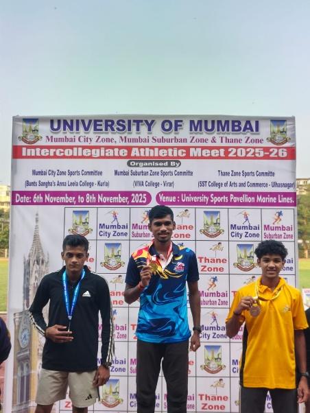Mr. Shailesh Mokal: emerged as one of the top athletes with multiple achievements, including 1st place in 400m at various Inter-University events (Mumbai City Zone, Intercollegiate, and 27th Maharashtra State Championship), 1st place in 4×100m relay at multiple Inter-University competitions, 2nd place in 200m, 3rd place in 200m, and 3rd place in 400m at Maharashtra Senior State Championship 2025. He also earned 2nd place (4×100m relay) and 3rd place (4×400m relay) at the Khelo India University Games 2025 (National level), highlighting excellence across levels.