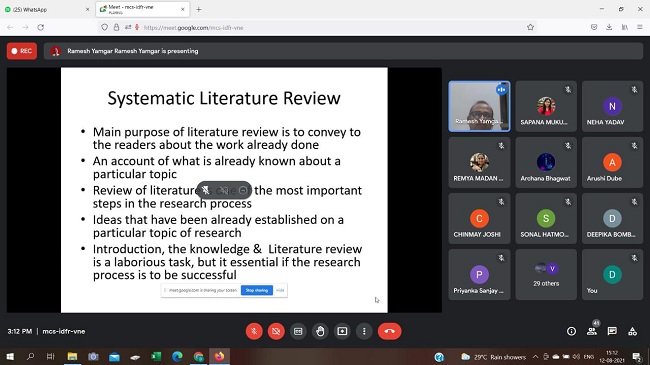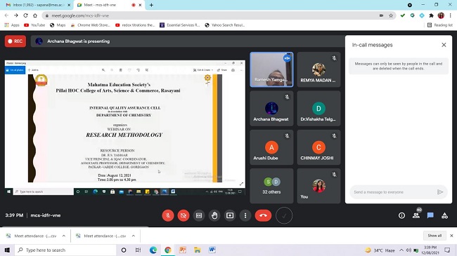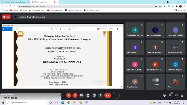 Department of Chemistry in association with Internal Quality Assurance Cell of Pillai HOC College of Arts, Science and Commerce College, Rasayani had organized One Day Webinar on “Research Methodology” 12th August, 2021 through online Google platform. Webinar was conducted for faculty members and students of PHCASC, 35 participants had participated in the webinar. Research oriented topics like Systematic literature review and research paper writing were discussed during the webinar.