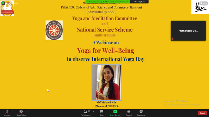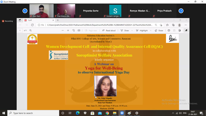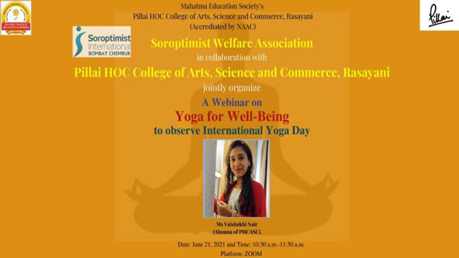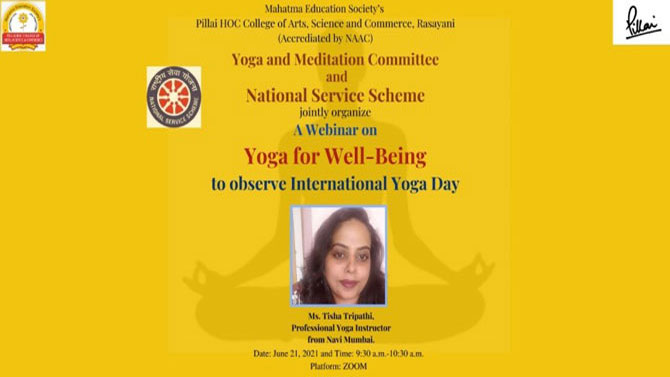 On the occasion of International Yoga Day, Yoga and meditation Committee of Pillai HOC College of Arts, Science and Commerce College, Rasayani in association with National Service Scheme (NSS) had organized a webinar on “Yoga for Well-Being” for students on 21st June, 2021, from 10.30 a.m. – 11.30 a.m. through the zoom platform.