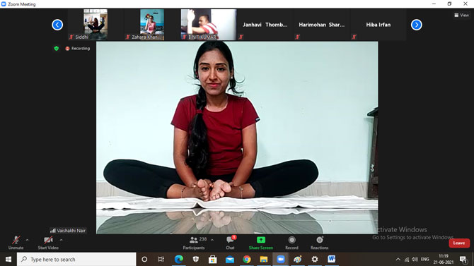 The event started with a welcome note and introduction of the resource person, Ms. Vaishakhi Nair by Ms. Hiba Irfan. The resource person explained the importance and correct way of yoga for a balanced life. Various asanas were practiced in the session by the students. The session started with Sukhasan and shavasan and continued with Bhujangasan, Swastika asan, Buddhakonasan and Padmasan. All the asanas were practiced by all the participants as per the instructions given by Ms. Vaishakhi Nair. E-Certificates were issued to all those who participated in the event. A total of 442 participants attended this event. The event ended with a vote of thanks by Ms. Hiba Irfan and positive feedback from the students.