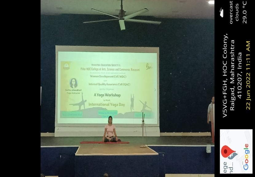 The Soroptimist Welfare Association (SWA) in association with the Women Development Cell (WDC) of Pillai HOC College of Arts, Science, and Commerce, Rasayani organized an event titled “Workshop on Yoga” to mark International Yoga Day on Wednesday, June 22, 2022.
