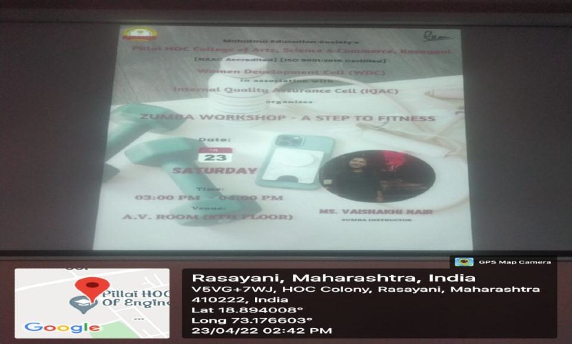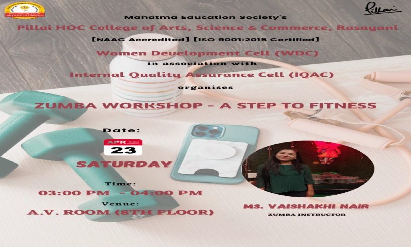 The Women Development Cell (WDC) of Pillai HOC College of Arts, Science, and Commerce, Rasayani in association with Internal Quality Assurance Cell (IQAC), organized a Zumba Workshop- A Step To Fitness on April 23, 2022.